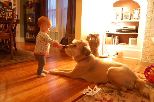 My baby turns one today. She is our last baby (unless someone sees fit to bequeath their child to us). All of her firsts have been both occasions for celebration and bittersweet reminders that this will be the final time we will observe such beginnings. Of course, I become wistful and sappy when remembering the day she was born. I was five days overdue and had resigned to the idea that I would be pregnant forever. But, she decided that in the middle of the night, during a good old fashioned Buffalo blizzard, that she was ready. My labor and delivery was unremarkable except for the fact that it was intensely fast and, at the same time, quiet and serene. Under a full moon, on a Thursday (just like H and Princess Commando) we welcomed her, Violet Emily. She was the crowning golden thread which completed our family’s tapestry. And, it felt as if she had always been with us. How had we gotten along for so many years without her?