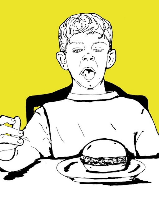 He slumped in the hallway and begged with puppy dog eyes to be accepted at our table where the three of us were enjoying our brownies. I made him sit at his place and complete his "Taste" homework. I suggested that he draw a picture of himself crying at the table with hamburger falling out of his mouth. Instead, he drew a picture of himself with a huge smile and an enormous burger in his hands. This is what he wrote: