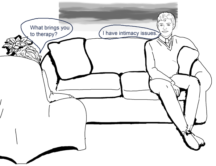 Therapist: I see that you've listed on your patient questionnaire that your reason for seeking counselling is "intimacy issues." Are you having trouble maintaining relationships with the opposite sex?
