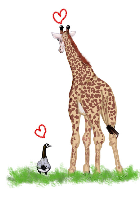 Goose and Giraffe loved each other even though they were impossibly different. Goose was prone to bouts of anxiety which led to fits of frantic honking and erratic wing flapping. Giraffe, so gentle and mild, was prone to long periods of complacency which were followed by an urgent need to make a change. But, they valued each other's companionship and accepted one another's stellar attributes as well as shortcomings. They found a good balance in life together.