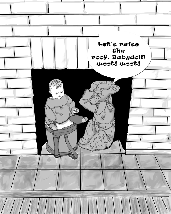 Maybe, with time, Babydoll will grow on The Baby. But for now, she has found a home in the fireplace with our flying monkey statue who is forever frozen in a "raise the roof" pose.