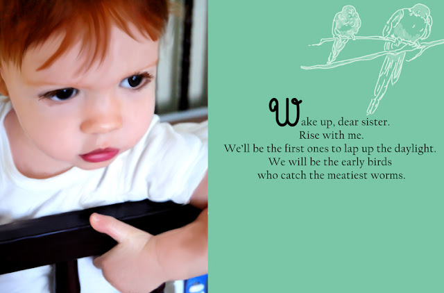My new favorite vision is of the girls in their room in the morning. I will hear Violet "talking" which has always been my cue to retrieve her from her crib. But when I open the door, I find that the conversation is no longer one sided. Princess Commando is either draped over the railing of the crib holding her sister's hand or she is groggily answering back in whispers from her own bed. I cannot make out what they are saying- but their voices are sweet and soft and I imagine their first few moments awake to be like this: