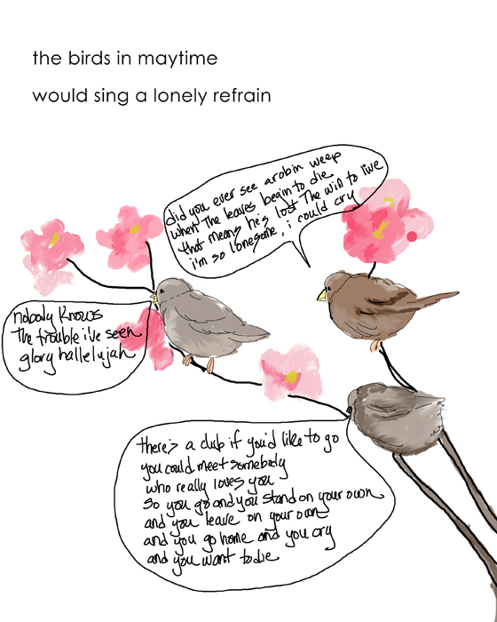 *Songs, Lyrics from the Birds illustration: So Lonesome I Could Cry, Hank Williams; Nobody Knows the Troubles I've Seen; How Soon Is Now?,Steven Morrissey, Johnny Marr