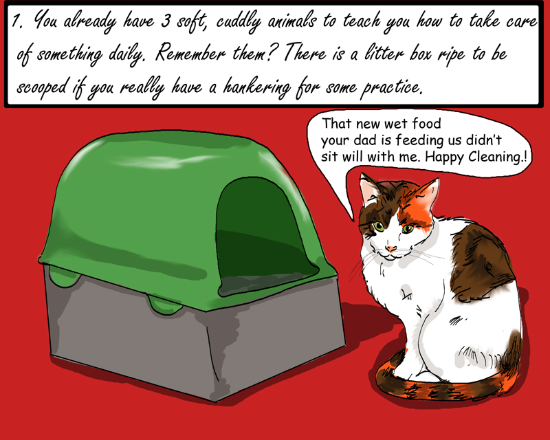 Hilarious. I do admire her initiative. Thats' a smart cookie you have. And yes, reptile carry salmonella on their skin. So you have to wash your hand constantly. Plus they do not cuddle. And- good rebuttal.