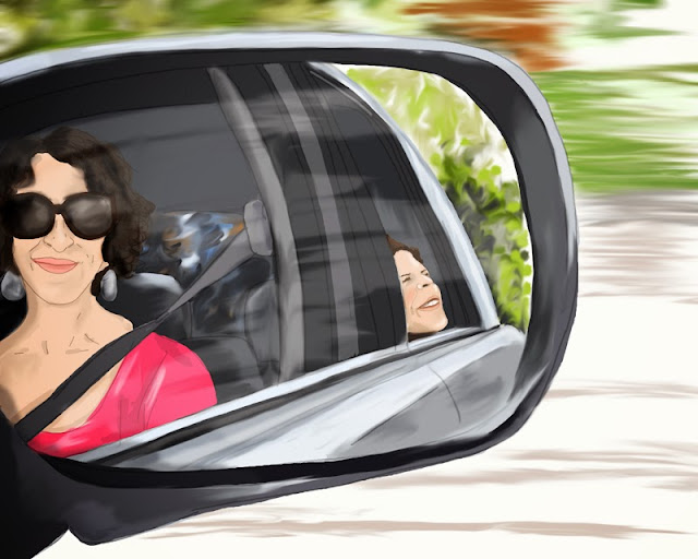 travels, my passenger’s side rear view mirror contains the image of my girl’s