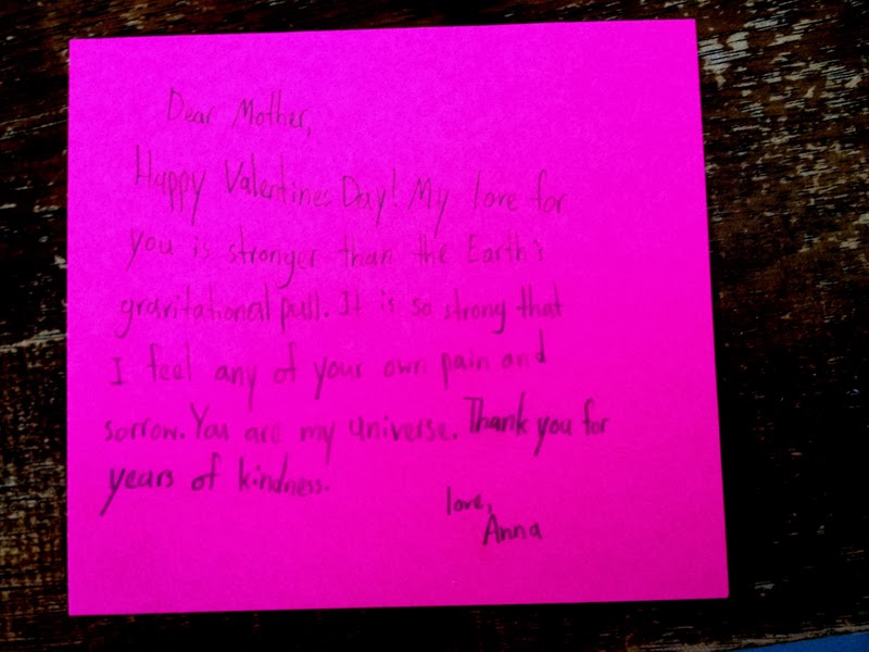 Happy Valentine's Day! My love for you is stronger than the Earth's gravitational pull. It is so strong that I feel any of your own pain and sorrow. You are my universe. Thank you for years of kindness. Love, Anna